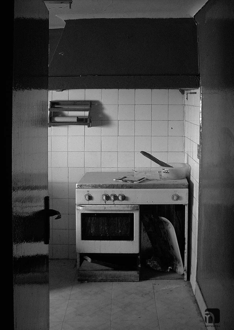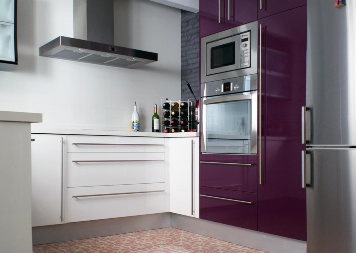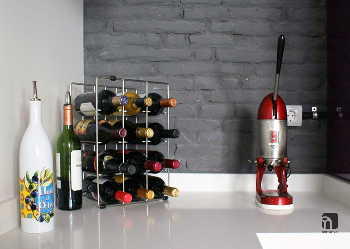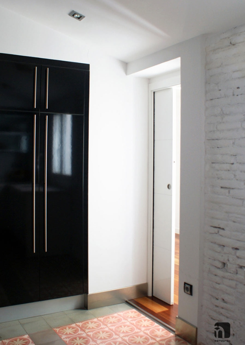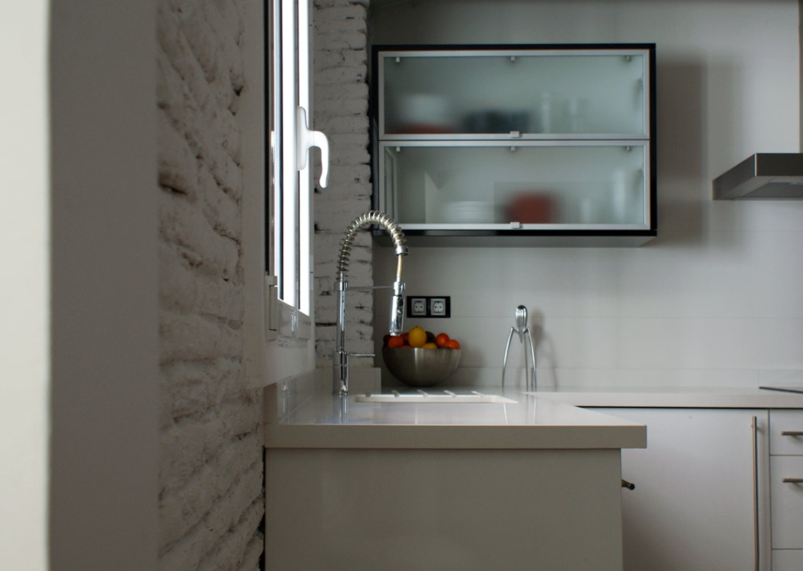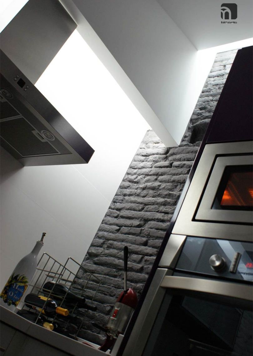 Buscando actualizar el espacio del salón, situado junto a la cocina y aprovechando su contigüidad, sin modificar la actual situación, y con solo prescindir del tabique de separación, conseguimos ampliar visualmente espacios, dándole no sólo amplitud, sino una mayor luminosidad a ambos. Para mantener una misma línea y diferenciar los espacios, se juega con diferentes materiales en el suelo, laminado en zona de salón y gres en cocina, pero en los mismos tonos. También marca la diferencia de espacios las diferentes alturas de los falsos techos, el mobiliario de la cocina, que además de contenedora, cumple una función separadora, pero también de nexo, invitando a sentarse en la isla que asoma al salón, terminada con una encimera de cuarzo blanco, color utilizado también en las baldosas de la pared y en el resto de los muebles de cocina, contrastando la terminación en acero inoxidable de los electrodomésticos.