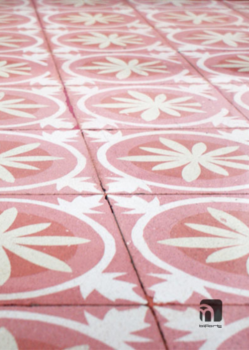 También se ha intervenido en un aseo contiguo, en el que el predominante blanco de la baldosa de pared, los sanitarios y la encimera, se cotrarresta con una baldosa porcelánica en suelo, imitando baldosa hidráulica de múltiples dibujos y colores y con un marcado tono azul en la pared.