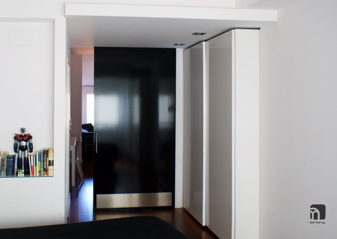 En el otro baño, también se opta por baldosa blanca para las paredes, como en el aseo y en la cocina, pero un porcelánico que imita madera, revestimiento elegido para el suelo, se prolonga sobre una de ellas, atravesando la ducha, tratando de dar una mayor profundidad al espacio. La transparencia del fijo de la mampara, concuerda perfectamente con dicha intención, así como la terminación en gris del suelo, que conjuga con el mobiliario. El encargado de proporcionar anchura, es un espejo que va de pared a pared a excepción de la ducha.